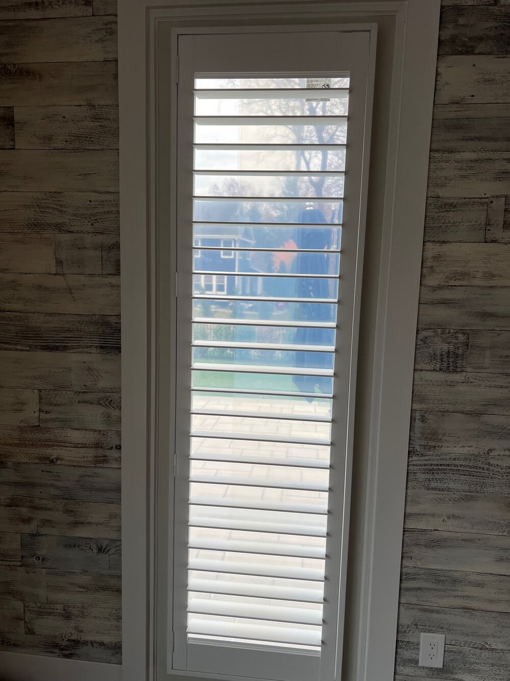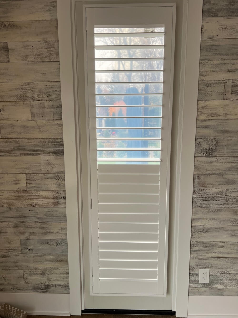 Beautiful Hunter Douglas interior door shutters installed in Brielle, New Jersey. These custom shutters were designed with a precise cut-out to accommodate a levered door handle, ensuring smooth functionality while maintaining a clean, tailored appearance. Mounted directly on the door, they provide a seamless built-in look that enhances the overall design of the interior space.