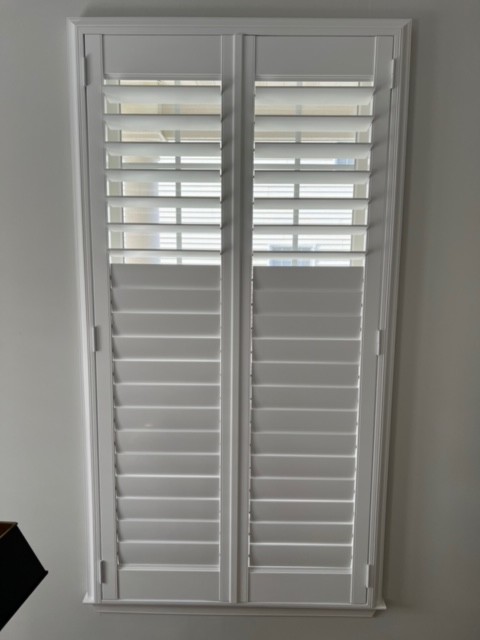 Monmouth County Blinds completed elegant interior shutters with 3 1/2" louvers featuring a hidden tilt and split tilt system. They are using 3-sided trim casing frames and sill plates along the bottom of the frames, finished in the color Polar White with white hinges. These shutters were all mounted on existing window moldings and installed in Ocean Township, NJ.
