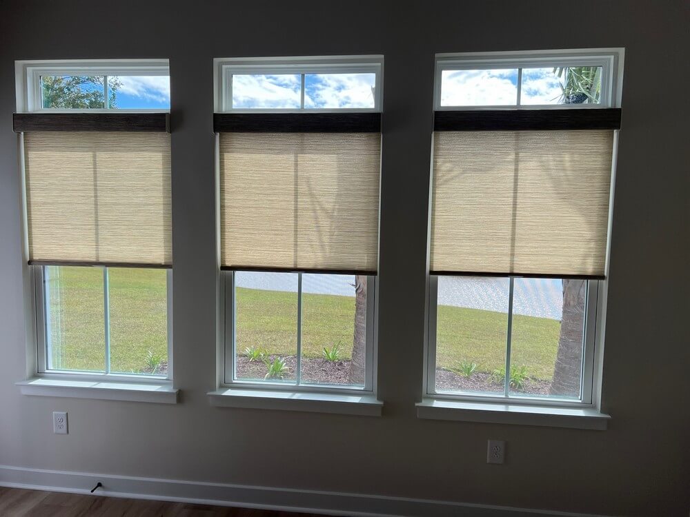 Monmouth County Blinds complete a recent project of sleek Hunter Douglas designer roller shades featuring LiteRise cordless system. The shades consists of a light filtering fabric pattern with the Maya color, Swiss Cream. Some are mounted inside window openings below transom window and on doors. All installation was done in North Myrtle Beach, South Carolina.